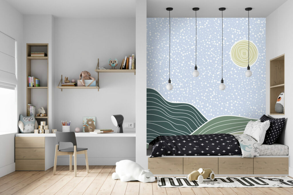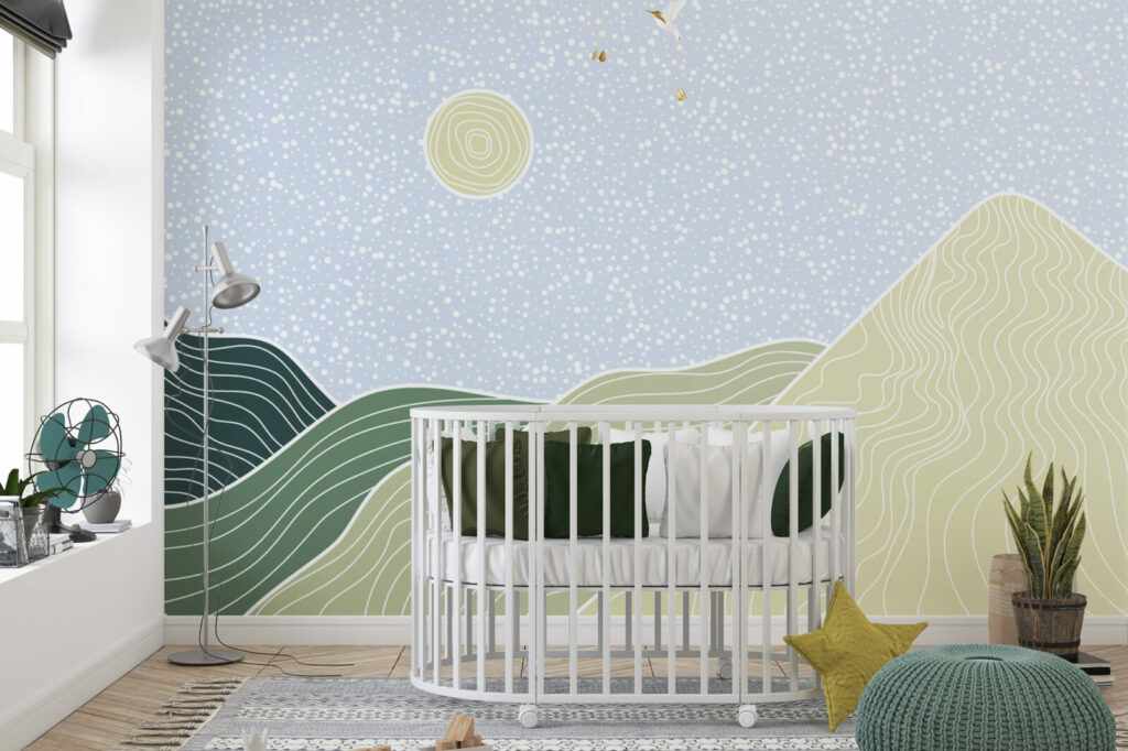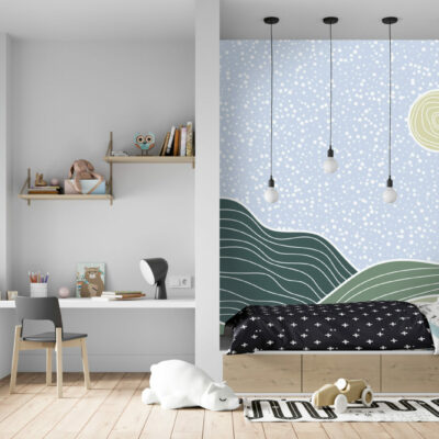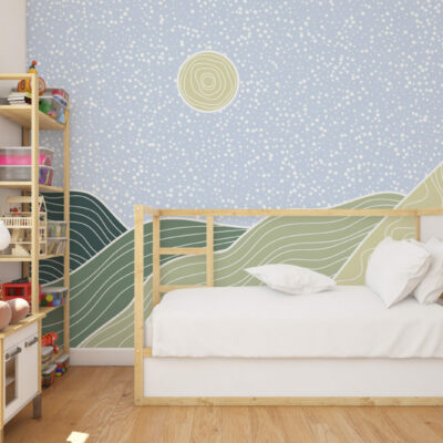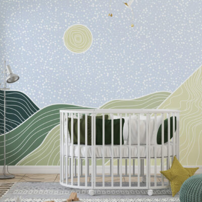 Le design se compose de reliefs ondulants dans des tons vert tendre, kaki et sable, surmontés d’un ciel bleu ponctué de points blancs évoquant une brume légère ou une pluie d’étoiles. L’ensemble est structuré par des lignes blanches fluides, qui créent un effet de mouvement reposant. Ce papier peint paysage graphique est idéal pour une décoration murale moderne, minimaliste et poétique.