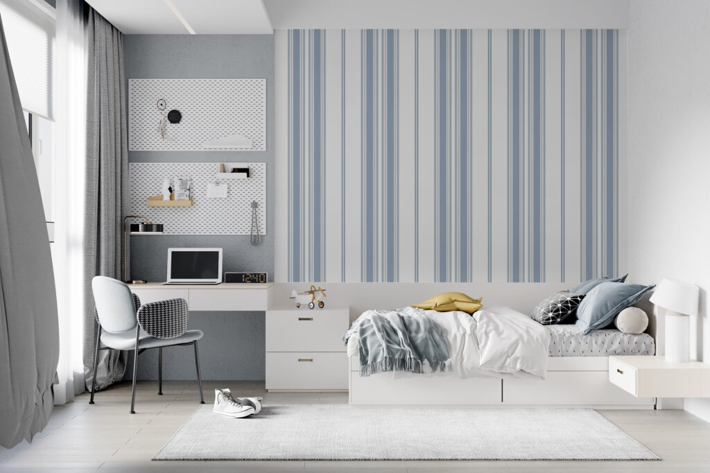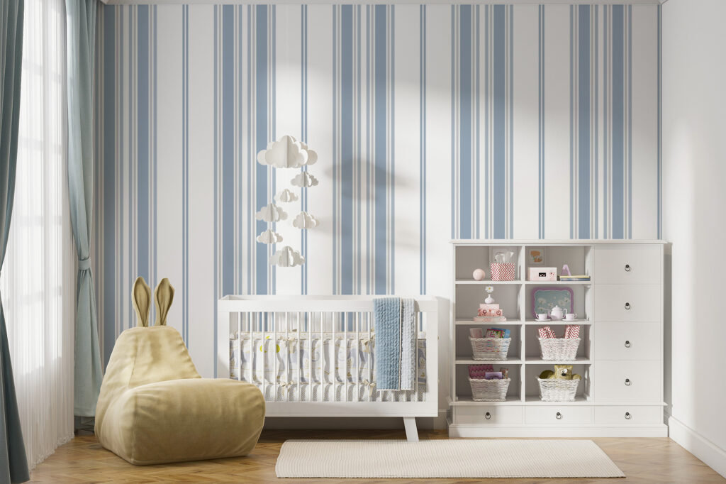 Pour créer un univers harmonieux, associez Blues Stripes à notre papier peint “Baby Pink” pour une chambre mixte douce et graphique.
