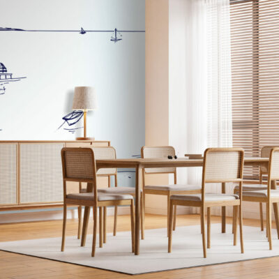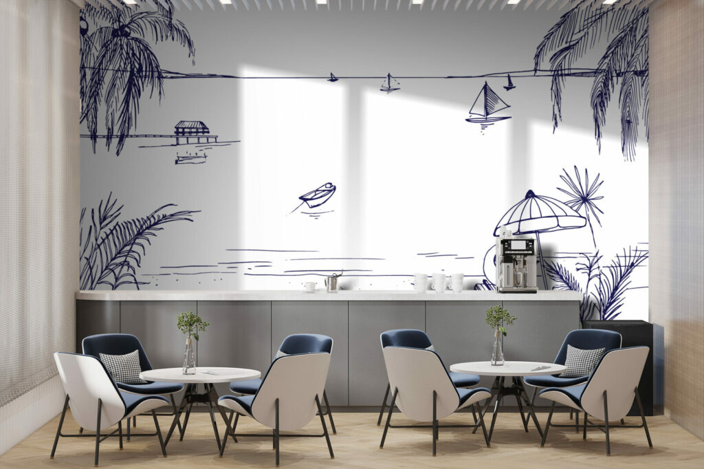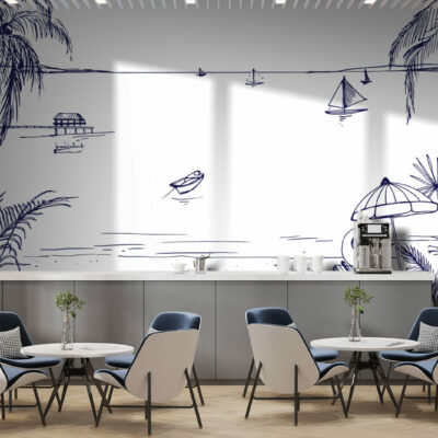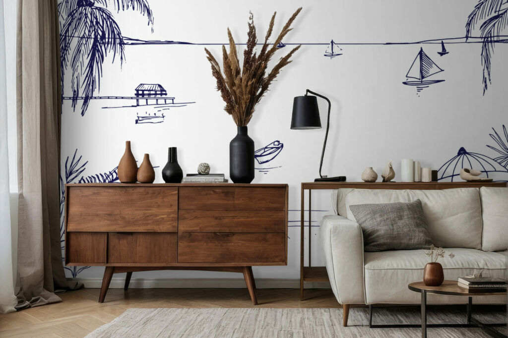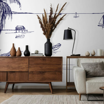 Le design monochrome en bleu marine sur fond blanc renforce le caractère paisible et raffiné de ce papier peint, lui permettant de s’adapter aisément à différents styles de décoration. Que vous ayez un intérieur moderne, bohème ou nautique, ce papier peint mural saura compléter votre espace avec élégance et subtilité. Les détails précis du dessin ajoutent de la profondeur et capturent l’essence du bord de mer, créant une atmosphère immersive et accueillante.