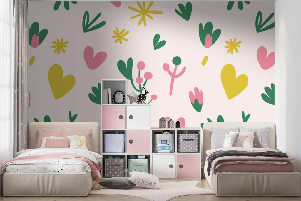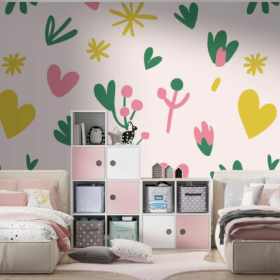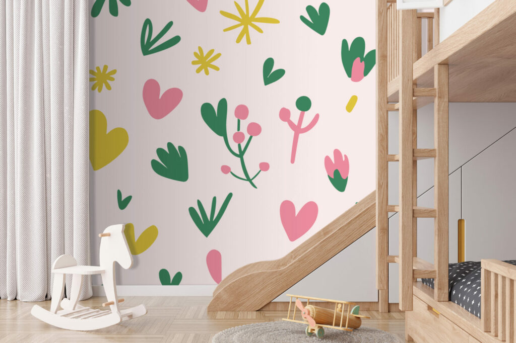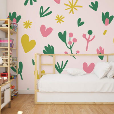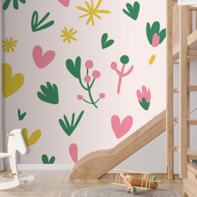 Les illustrations simplifiées des fleurs et des cœurs sont disposées de manière équilibrée, créant un motif répétitif qui attire le regard sans être trop envahissant. Le fond légèrement rosé met en valeur les couleurs vives des motifs, tout en conservant une douceur visuelle. Ce papier peint Spring Lover est idéal pour ceux qui souhaitent apporter une touche ludique et moderne à leur décoration intérieure, sans compromettre l’harmonie des couleurs.