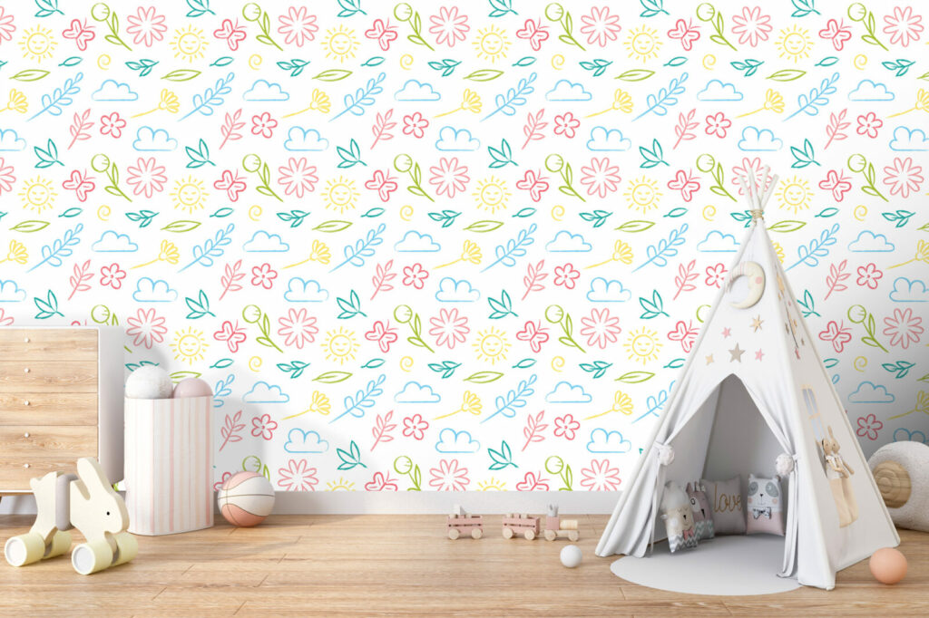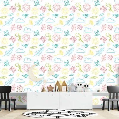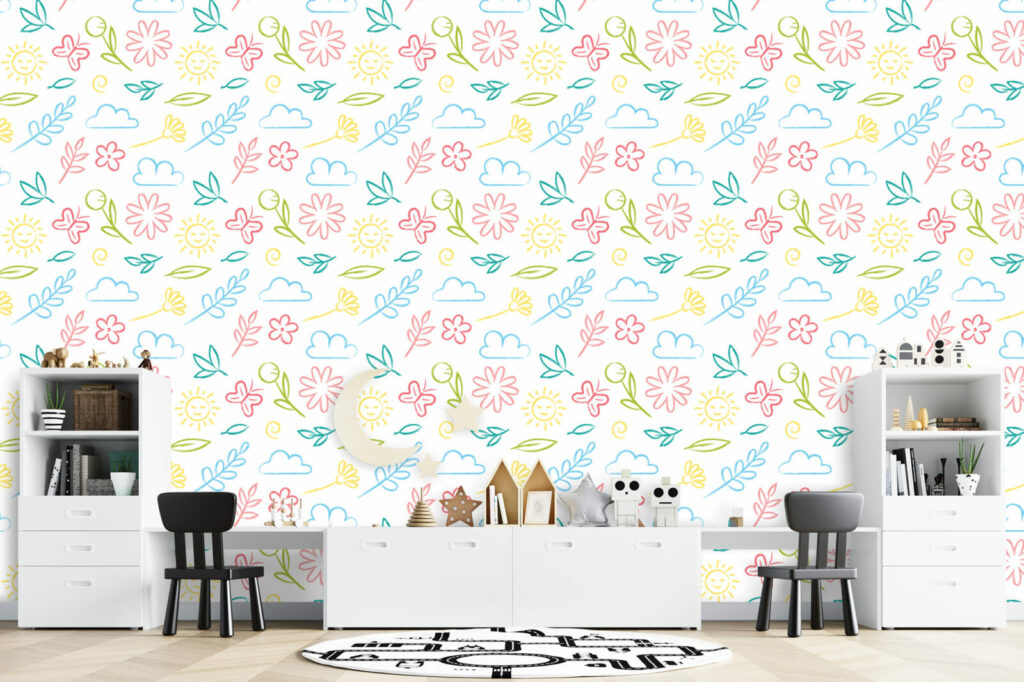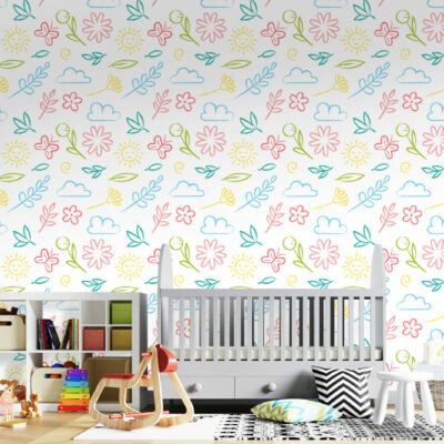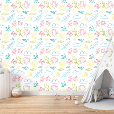 Découvrez notre magnifique papier peint Summer Drawing au motif estival, idéal pour apporter une touche de fraîcheur et de gaieté à vos espaces intérieurs. Ce modèle présente un design charmant avec des dessins de fleurs, feuilles, nuages et soleils souriants dans des teintes douces et apaisantes. Les couleurs pastel, comme le rose, le jaune, le bleu et le vert, créent une ambiance joyeuse et relaxante, parfaite pour les chambres d’enfants, les salles de jeux ou encore un coin lecture dans une crèche.
