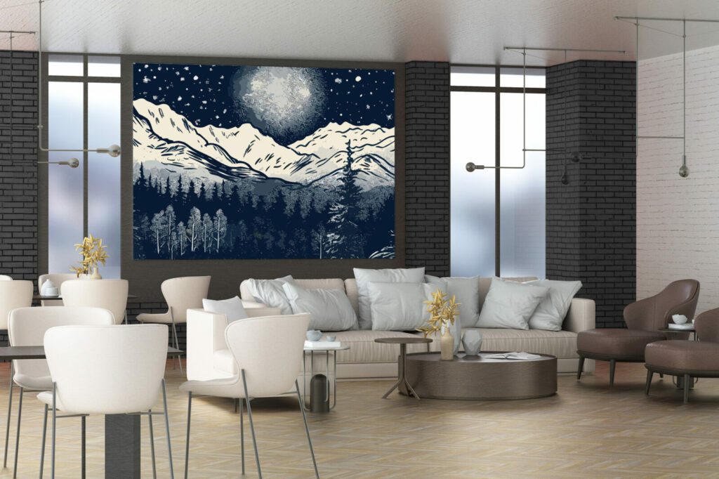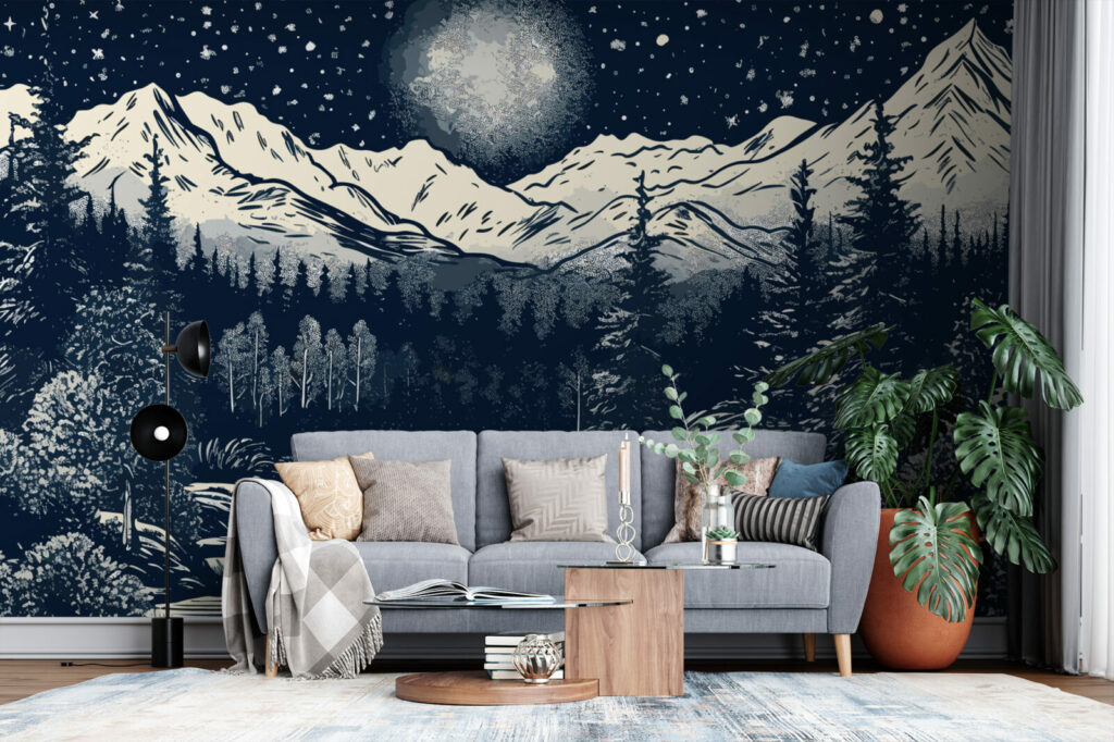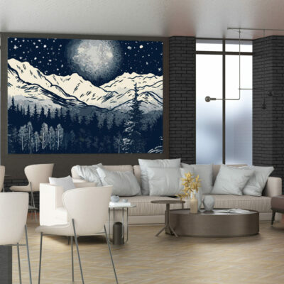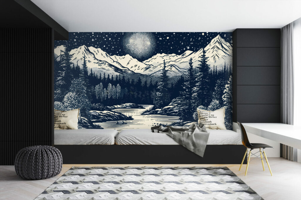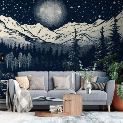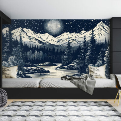 Voici le papier peint panoramique River Mountains, une œuvre d’art sur mesure réalisée spécifiquement pour vous. Dans un ciel étoilés se détachent les montagnes enneigées, une foret dense et épaisse, une rivière qui coule au milieu de cette toile peinte en blanc, noir et gris. Cette magnifique pièce est parfaite pour ajouter une touche de personnalité à votre chambre ou à votre salon. Sa finition mate lui confère un caractère à la fois unique et durable, pour que vous puissiez en profiter pendant des années. Que vous le préfériez tout autour de votre pièce ou en mur d’accent, optez pour ce motif dans une salle à manger, un salon, une cuisine ou une chambre cocooning et regardez votre intérieur prendre vie.