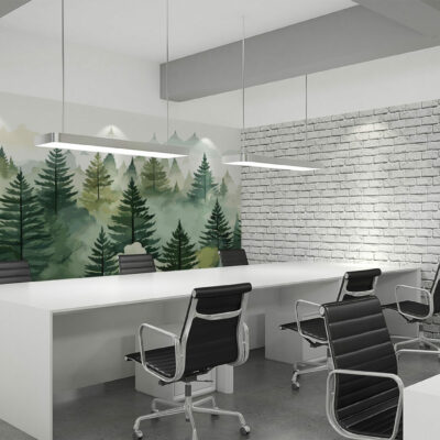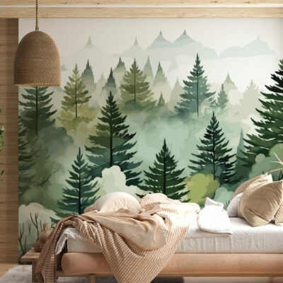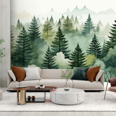Diffusez dans votre intérieur la calme et le charme des arbres enveloppés de brume avec ce papier peint personnalisable Watercolor Forest à l’Aquarelle. Ce modèle peint à la main et fait sur mesure se caractérise par des tonalités vert foncé, vert clair, élégantes et profondes, parfaites pour introduire un thème naturel dans le salon, la salle de bains, la chambre ou autres pièces. Apporter la beauté d’une forêt de sapins sur vos murs, ce papier peint personnalisable Watercolor Forest unique ajoutera une profondeur intense à l’espace et pourra être complété par un mobilier traditionnel ou scandinave, selon vos goûts.