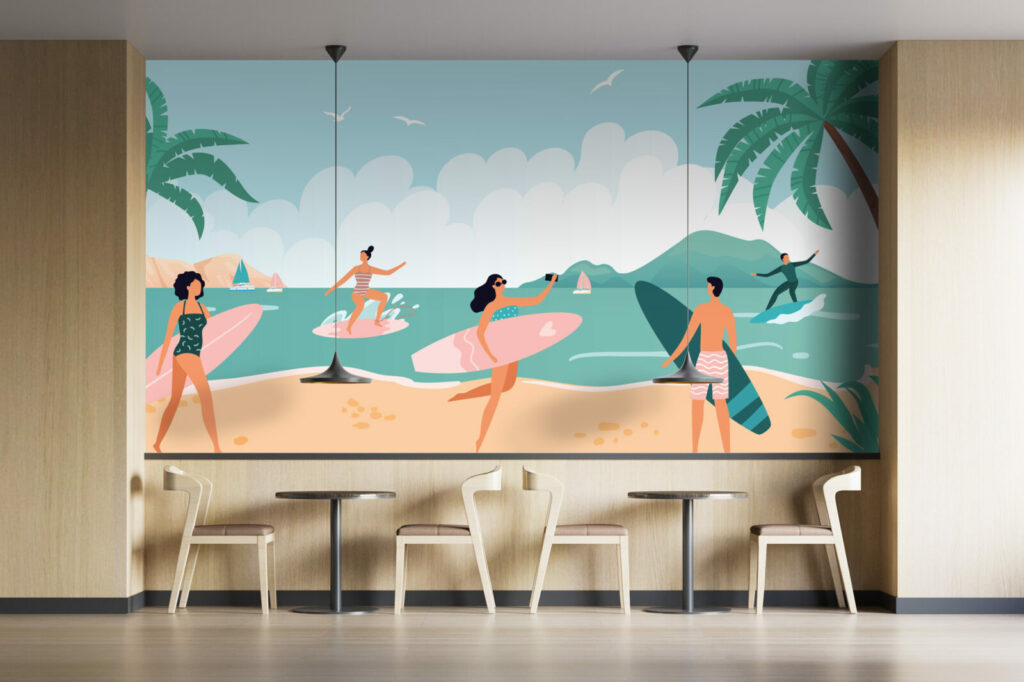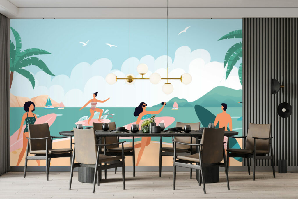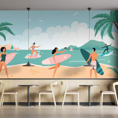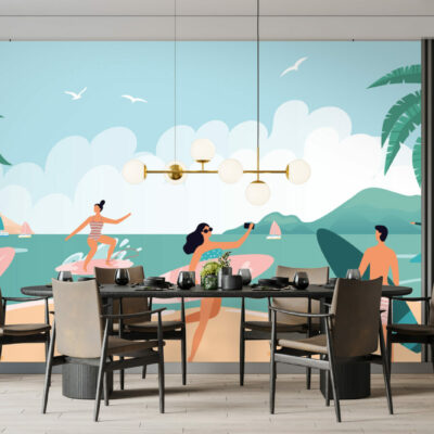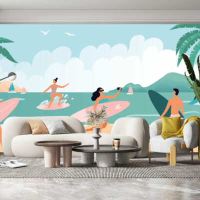 Adoptez un papier peint surf plage et palmiers avec un thème original pour ajouter une touche inhabituelle à la chambre, à la salle de bain ou à toute autre pièce. Découvrez notre Papier Peint surf plage et palmiers, un dessin qui présente de sympathiques illustrations des personnages pratiquant le surf. Le motif de ce papier peint est parfait pour donner vie à un look contemporain sans être trop intrusif. Dessiné avec des couleurs douces, ce papier peint maritime peut s’adapter à différents styles décoratifs.