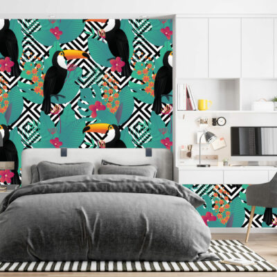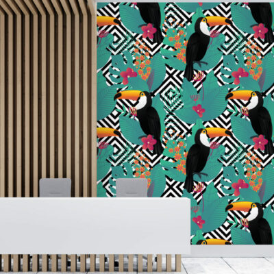 Découvrez le Papier Peint Toucan, un joli décor mural pour la chambre des enfants qui épanouira leur imagination. Ce dessin illustré très tendre représente des toucans perchés qui contemplent ce qui se passe sous eux. Les toucans sont posés sur des feuillages verts en transparence apparaissent des labyrinthes noirs, qui donnent de la profondeur à votre mur. Ce papier peint à thème oiseaux est idéal pour créer une atmosphère ludique et détendue dans la chambre des enfants.