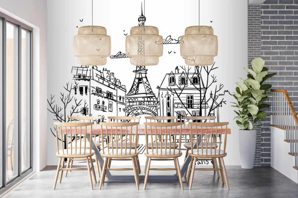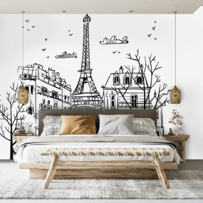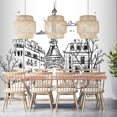 Ajoutez le charme de la Ville Lumière à votre pièce avec le Papier peint tour Eiffel illustrés en Blanc et Noir. Des lignes dessinent le profil des célèbres toits de Paris et en fond la tour Eiffel qui est le symbole de la ville. Ce Papier peint tour Eiffel est un modèle sophistiqué qui se distingue par l’équilibre entre sa simplicité et ses petits détails. Idéal pour le salon, la chambre ou le bureau, ce dessin ajoutera dans vos espaces le glamour et la créativité de la vie parisienne et de ses célèbres édifices avec les toits poétiques. Essayez ce papier peint Paris 3 avec un mobilier rétro pour créer un style parfait pour la capitale française.