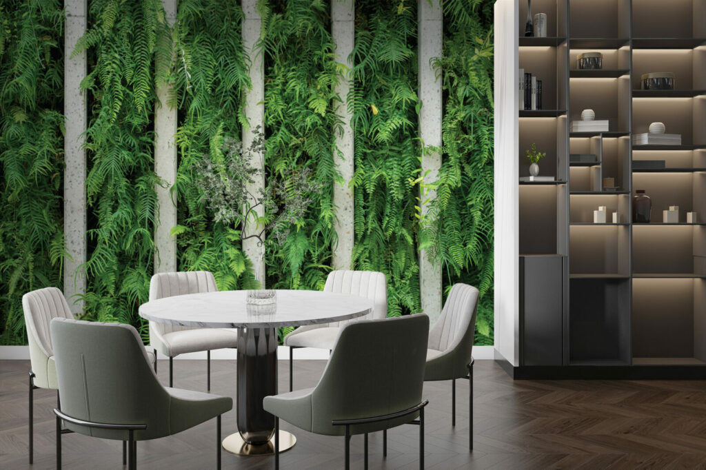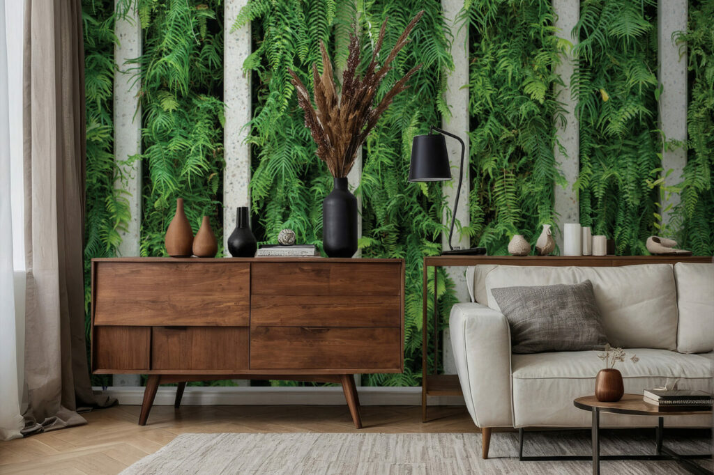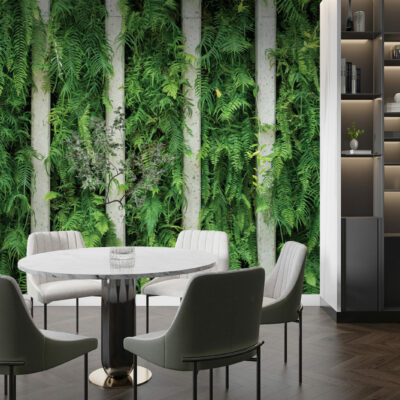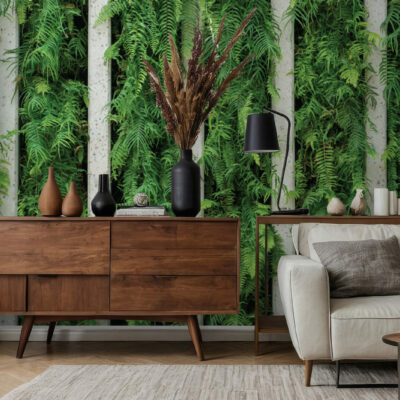 Les feuilles de fougères, disposées entre des colonnes architecturales, évoquent une ambiance sereine et apaisante. Le contraste entre les lignes verticales nettes des colonnes et l’abondance organique des plantes crée une harmonie visuelle parfaite, rendant ce papier peint aussi élégant que relaxant. Parfait pour transformer un mur d’accent ou pour recouvrir entièrement une pièce, ce papier peint apportera une touche unique aux espaces comme les salons, chambres ou bureaux.