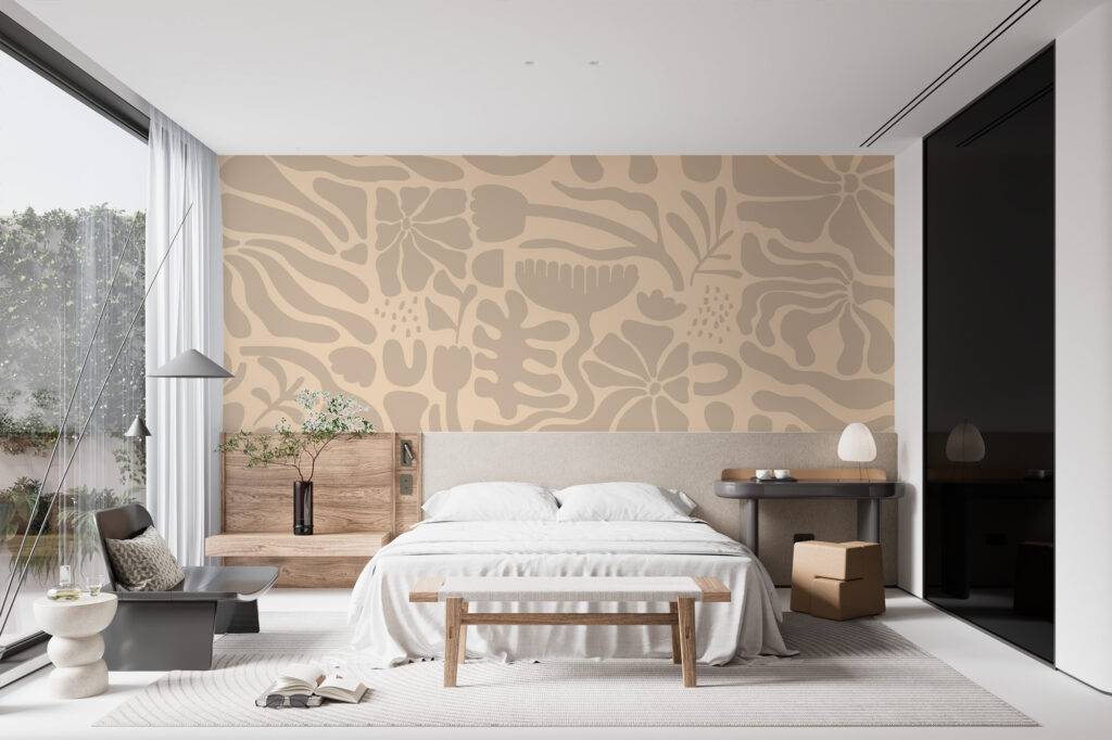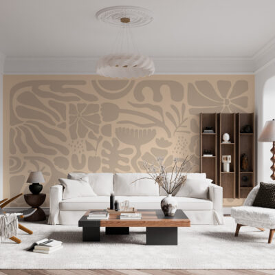 Ensuite, la palette de tons beiges et sable renforce cette sensation de calme et d’élégance. Les nuances naturelles se fondent délicatement les unes dans les autres, sans contraste brutal. Grâce à cette chromatique douce, le décor mural diffuse une lumière chaleureuse et s’intègre facilement dans de nombreux intérieurs. Il sublime l’espace sans jamais l’alourdir.