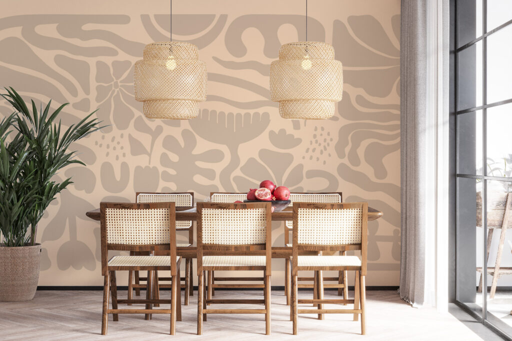 Tout d’abord, le design se distingue par son approche abstraite. Les motifs végétaux ne cherchent pas la représentation réaliste. Au contraire, ils s’expriment à travers des aplats souples, des lignes arrondies et des silhouettes simplifiées. Cette écriture graphique crée un rythme visuel harmonieux, presque méditatif. Ainsi, le papier peint végétal abstrait Floroma transforme le mur en une véritable composition artistique.