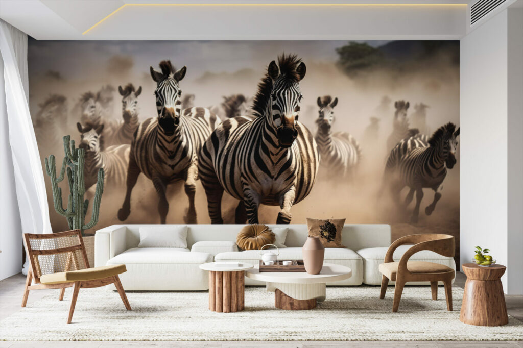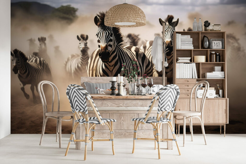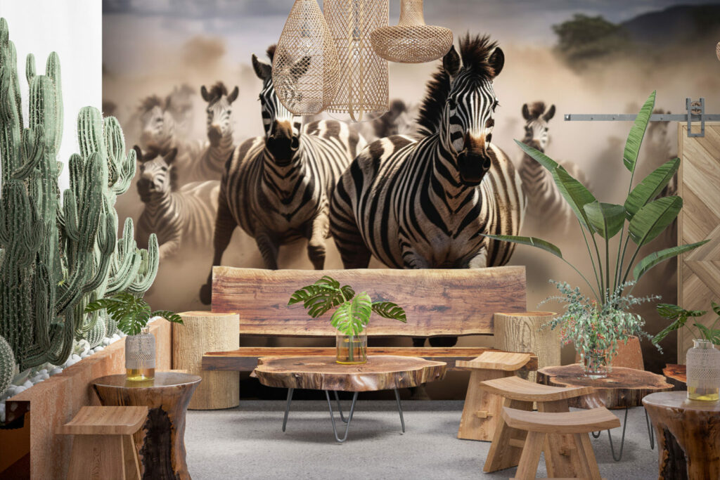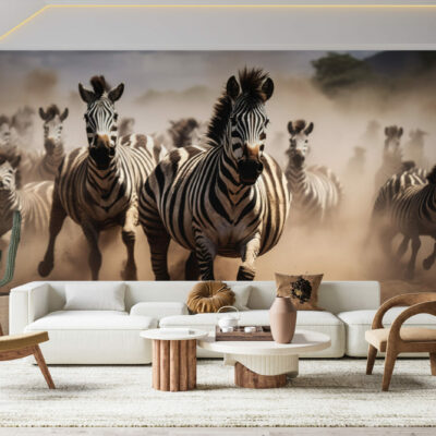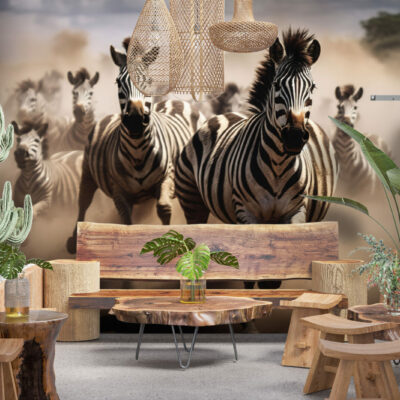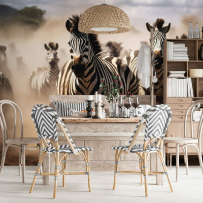 Pour une déco Africaine, tout en élégance, le papier peint Zebras Running est un choix audacieux. Ce papier panoramique très réaliste aux couleurs noir, blanc et fauves, contribue largement au charme de votre espace de vie. Conviendra tout aussi bien dans une chambre, un salon, une salle à mange, un bureau, un espace détente. Le zèbre est un animal très apprécié en décoration. La plupart du temps, on le retrouve seul. Il est en effet plus rare de le voir entouré de ses semblables, comme c’est le cas ici. Dans ce troupeau, un zèbre se détache. Un zèbre qui attire immédiatement notre regard et qui parait nous fixer droit dans les yeux. Se passe alors quelque chose d’inexplicable. Un sentiment étrange et pénétrant, qui rend ce papier peint envoûtant.