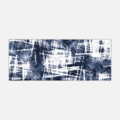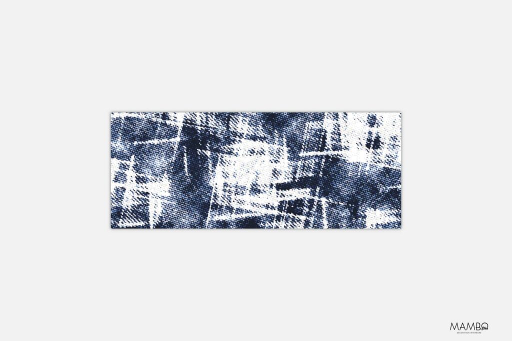 Le design évoque une toile de lin imprimée à la main. Les coups de pinceau irréguliers s’entrecroisent et laissent apparaître des zones plus claires, presque effacées. Le bleu indigo domine, profond et vibrant, contrasté par des touches de blanc ivoire. Ce jeu de superposition donne l’impression d’un tissu usé, entre shibori japonais et denim vieilli.