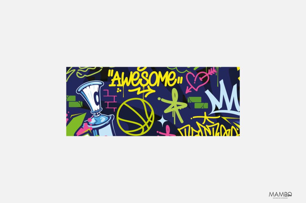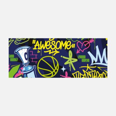 🎨 Le fond bleu nuit intense contraste avec des teintes vives jaunes, roses, vertes et bleues. On y retrouve des motifs typiques du graffiti : lettrages, flèches, briques, bombes, tags stylisés. Un vrai clin d’œil à la culture hip-hop et aux années 90. Ce sticker décoratif est idéal pour une chambre d’ado, un espace créatif ou un intérieur moderne et décalé. Il convient également à une déco industrielle ou contemporaine cherchant une touche d’impertinence.