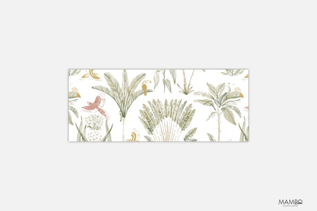 🌿 Ce modèle évoque les illustrations botaniques anciennes, revisitées dans un style plus moderne. Les couleurs naturelles — vert tendre, beige sable, brun terreux et rose corail — créent une atmosphère calme, lumineuse et dépaysante. Les petits oiseaux exotiques apportent une note de légèreté, idéale pour une déco intérieure nature, bohème ou coloniale.