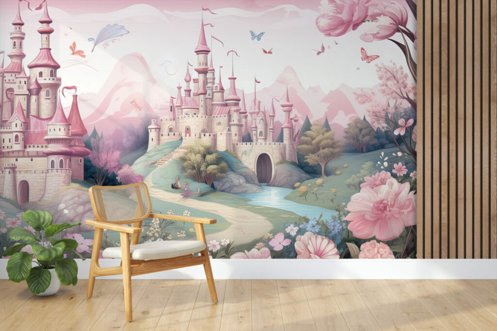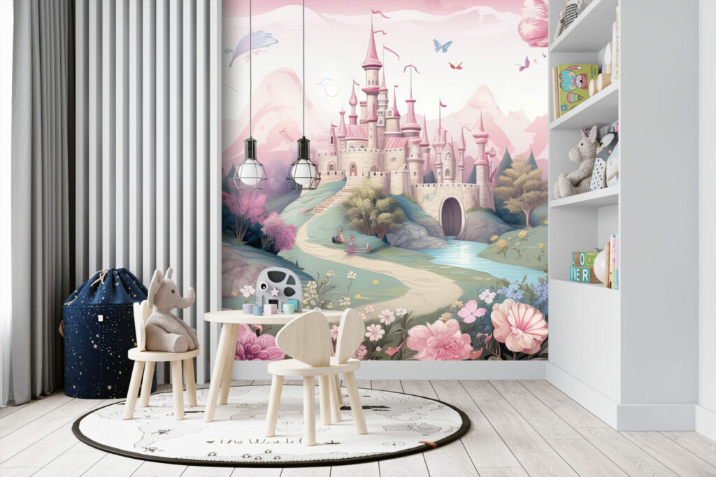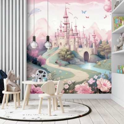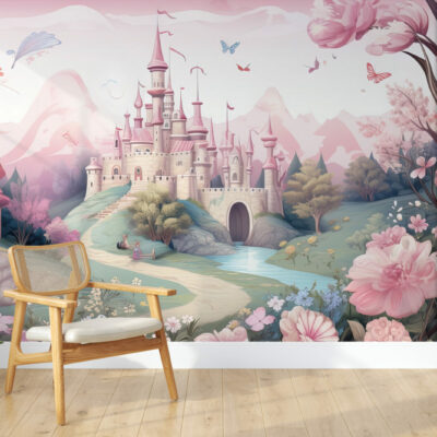 Créez une décoration inspirée des contes de fées dans la chambre de votre enfant pour l’encourager à laisser libre cours à son imagination avec la tapisserie château de princesse rose. La représentation du grand château montre des majestueuses montagnes tout autour ainsi que des papillons dans le ciel, créant un papier peint merveilleux qui transformera sa chambre en un monde enchanté. Les roses poudrés, les verts et les bleus apportent douceur et élégance à ce papier peint avec de magnifiques détails aquarelles.